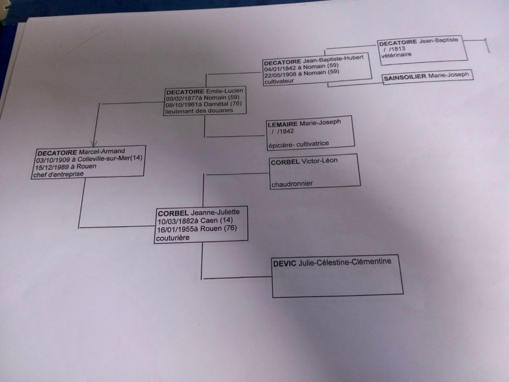 Son fils, Marcel, est donc le frère de mon grand père paternel, Maurice DECATOIRE (né en 1905, mort en 1982) et le grand-père de Pascal, mon cousin retrouvé… On a bien besoin d’un petit arbre généalogique pour s’y retrouver non ? Merci Pascal !