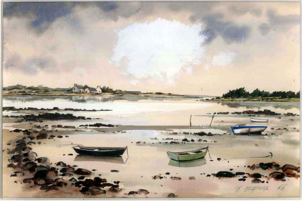 Voici les 2 aquarelles qui sont chez nos amis de toujours les GUESDON. Sur l’une d’entre elle, on voit une vedette rouge et blanche : il s’agit de la marie-Joseph qui était le bateau commun de mon père et de Roger GUESDON. Ce n’est pas sur ce bateau que Christian était le jour de sa noyade mais sur l’Aldébaran, un autre navire acheté en commun (avec un autre ami je crois, Jean LECLERC). En effet, la Marie Joseph avait fait naufrage un jour de tempête à Carnac en 1968 je pense… Elle était (mal?) amarrée au mouillage devant la maison de mon oncle à Saint Colomban et elle s’est échouée contre les rochers… Quand nous étions petits, les parents nous chantaient la chanson des Frères jacques, « LA MARIE JOSEPH » est un beau bateau » voir ici la vidéo : https://www.youtube.com/watch?v=Nln_l4YFyRc
